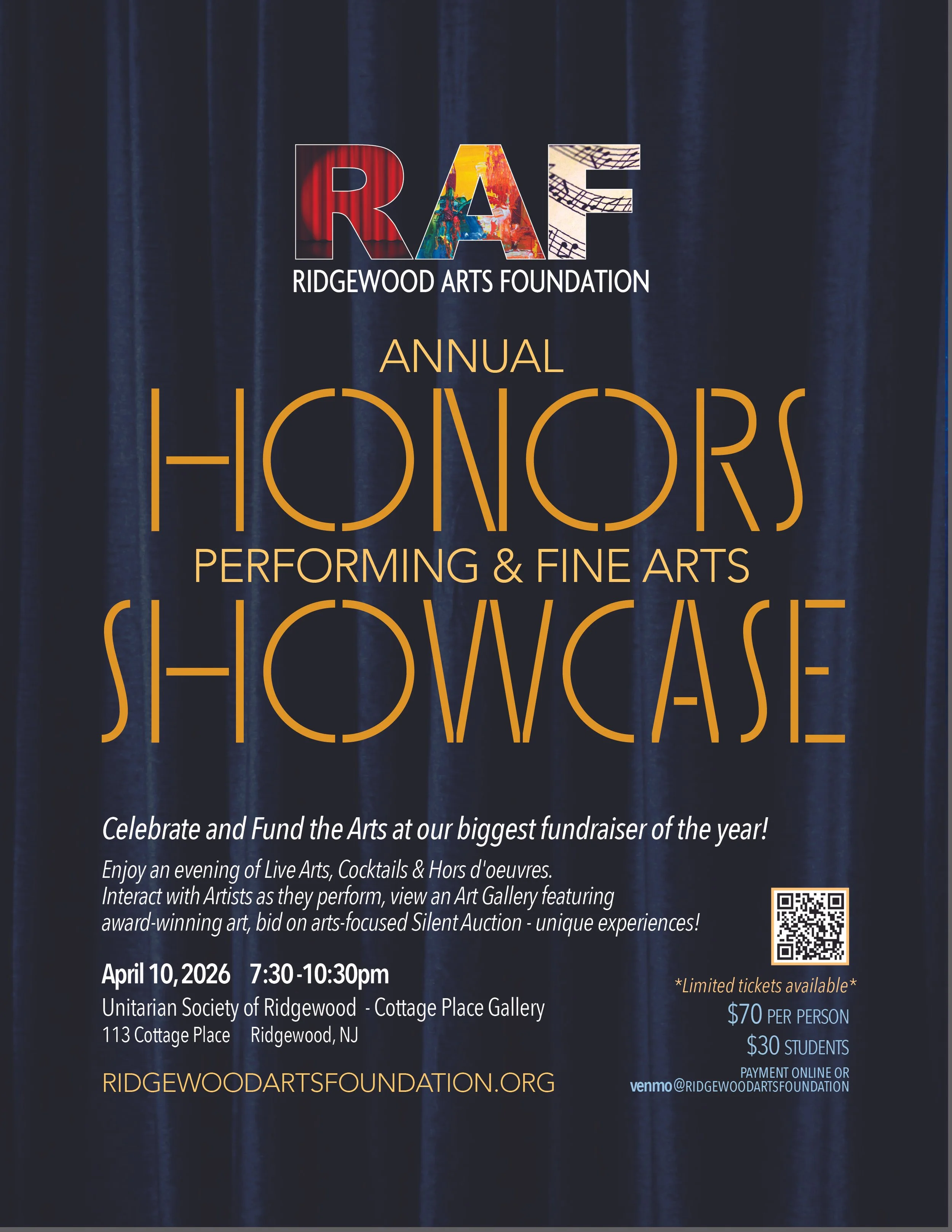 The Ridgewood Arts Foundation (RAF) is a New Jersey based non-profit corporation with 501(c)(3) status from the Internal Revenue Service, and is thereby recognized as a public charitable foundation.